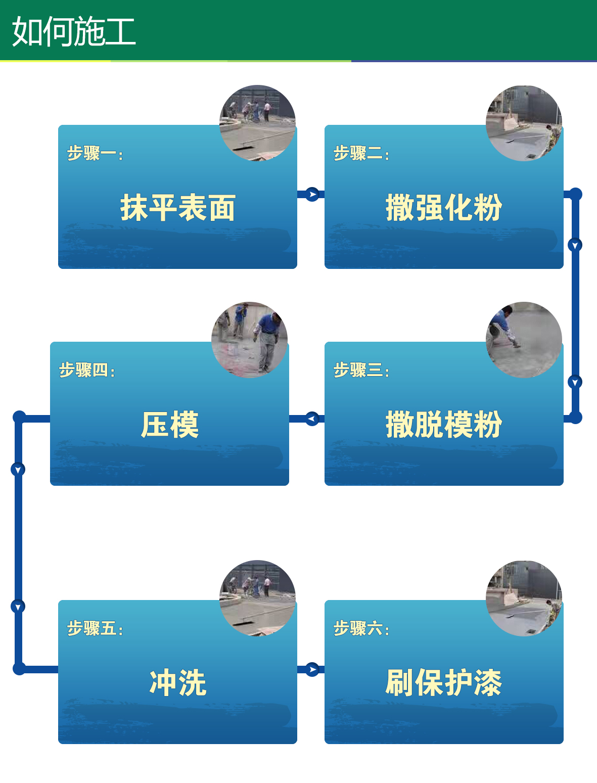 5.播撒強化料時(shí)嚴格按照施工工藝要求進(jìn)行,不要過(guò)分鏟抹混凝土表層,否則會(huì )導致表面出水并減弱色彩。