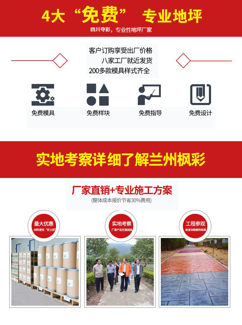 4.待彩色強化料吸水硬化后,用鋼抹子收光表面并撒布著(zhù)色脫模粉。然后使用已選定的模板,根據設計圖案和模板的形狀,從鋪設的混凝土一端開(kāi)始壓印,操作過(guò)程中要保持模板的相交線(xiàn),橫平豎直,使用軟模板將邊角壓到。壓印時(shí)間要掌握準確,過(guò)早的話(huà)壓出的表面為毛面,沒(méi)有光澤度,而且表面耐磨性很差,嚴重影響質(zhì)量;過(guò)晚則會(huì )難以壓出完整的紋理,影響美觀(guān)。