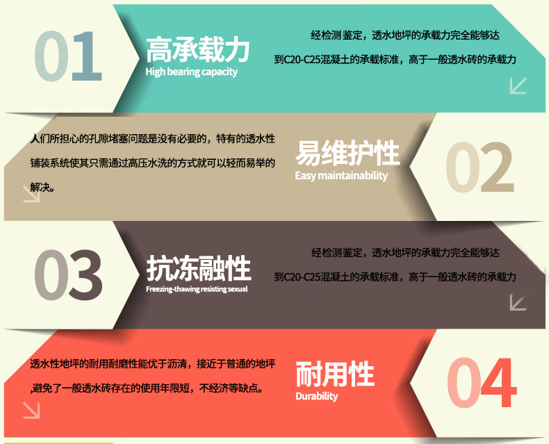街道透水混凝土是由骨料、高標號水泥、摻合料,水性樹(shù)脂、彩色強化劑、穩定劑及水等拌制而成的一種多孔輕質(zhì)混凝土,由粗骨料表面包覆一薄層漿料相互粘結而成孔穴均勻分部的蜂窩狀結構,故具有透氣、透水和重量輕的特點(diǎn),作為環(huán)境負荷減少型混凝土,透水地坪的研究開(kāi)發(fā)越來(lái)越受重視。